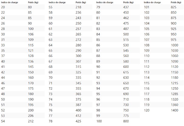 Vous pouvez comparer l’indice de charge avec le tableau ci-dessous pour connaître la charge maximum en kg que le pneumatique peut supporter.